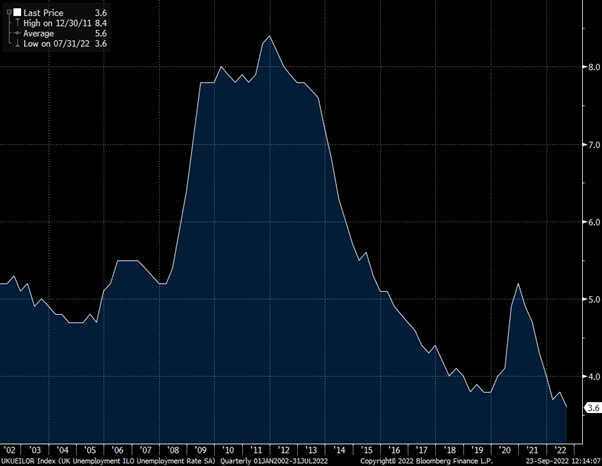 We are currently in the loose/loose box. Taking the unemployment rate as a simple measure of the output gap, you can see from the chart below we are at record lows. This is also clear to anyone trying to hire at the moment and all the reports of staff shortages. Which makes it odd that Truss talks about “boosting growth” as there is no prospect of lower unemployment from here.