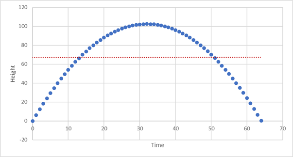 If we ran a Pearson r correlation analysis instead of drawing the picture, we would find there is ZERO correlation between height and time. Other statistical correlation measures, such Spearman’s rho which looks for monocity may pick up non-linear monotonic relationships, but also will not help you here for a parabolic relationship.
