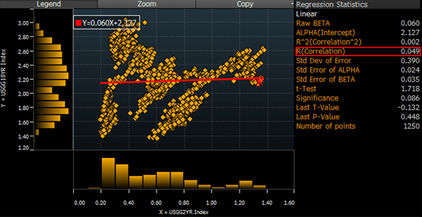 Take an example from financial markets, there is an intuitive connection between the short end and the long end of the bond market. If we look at US government bond yields 2 year (x-axis) versus 10 year (y-axis) over the last 5 years (chart below). The correlation between their levels is virtually zero and, if we were to only look at correlation, we may falsely conclude there is no relation between them.