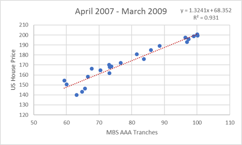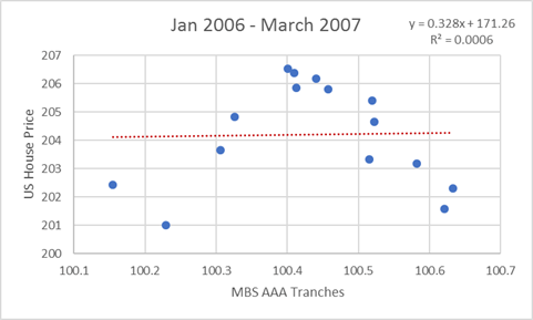 A more dramatic example with very dangerous consequences was the lack of a correlation between US house prices and the price of AAA tranches of mortgage backed securities before the crisis.