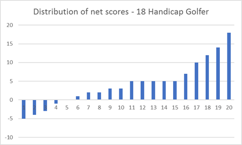 Let’s take a simplified case to illustrate the issue. Let the scratch (zero handicap) golfer have zero volatility i.e. they shoot level par gross and net every time. Let the 18-handicapper have a more realistic (and obviously higher) volatility of score.