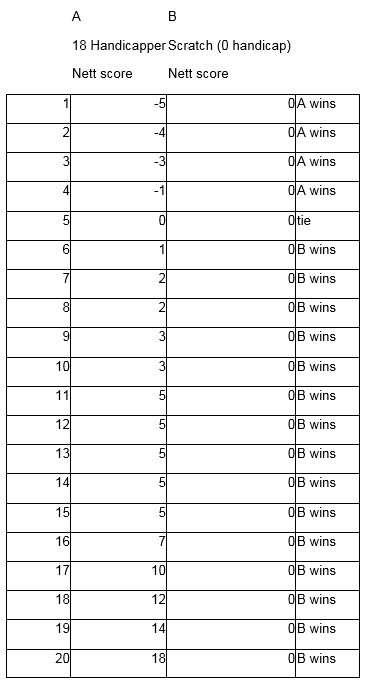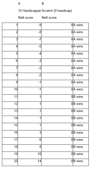 High handicapper A wins only 4 times out of 20 while low handicapper B wins 15 times out of 20.