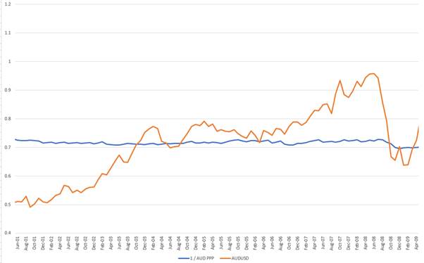It did not rise like this because of a succession of incremental pieces of random news which happened to cumulate in a massive movement. It happened because the currency was by first order approximation far too cheap. A useful first order approximation model for currencies is Purchasing Power Parity (indices are freely available and calculated by the OECD). The chart below shows that the PPP of the AUD was very steady at around 0.70 cents. In 2001 it was very cheap, and when it approached parity it was very expensive. Capturing these kinds of move is where I spend my time and historically where I have made my biggest profits.